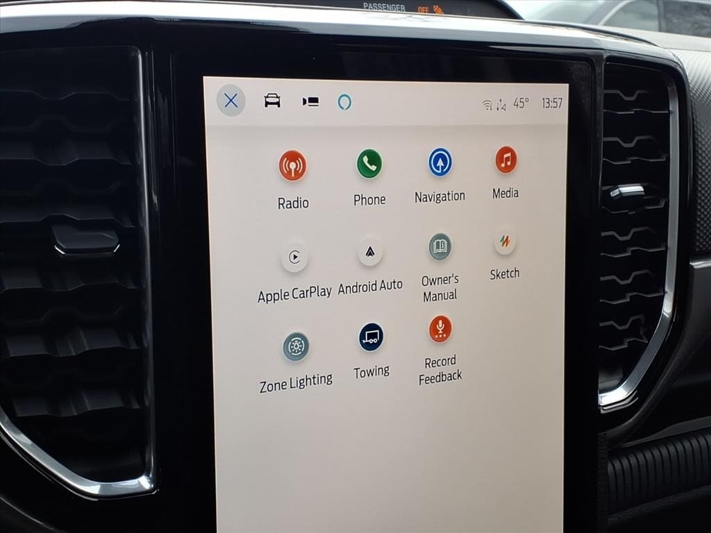 Inside, the Ranger's spacious cabin is outfitted with premium cloth front bucket seats, dual-zone electronic climate control, and a 12-inch display in the center stack. The power-sliding rear window and black running boards add both style and functionality to this exceptional truck.